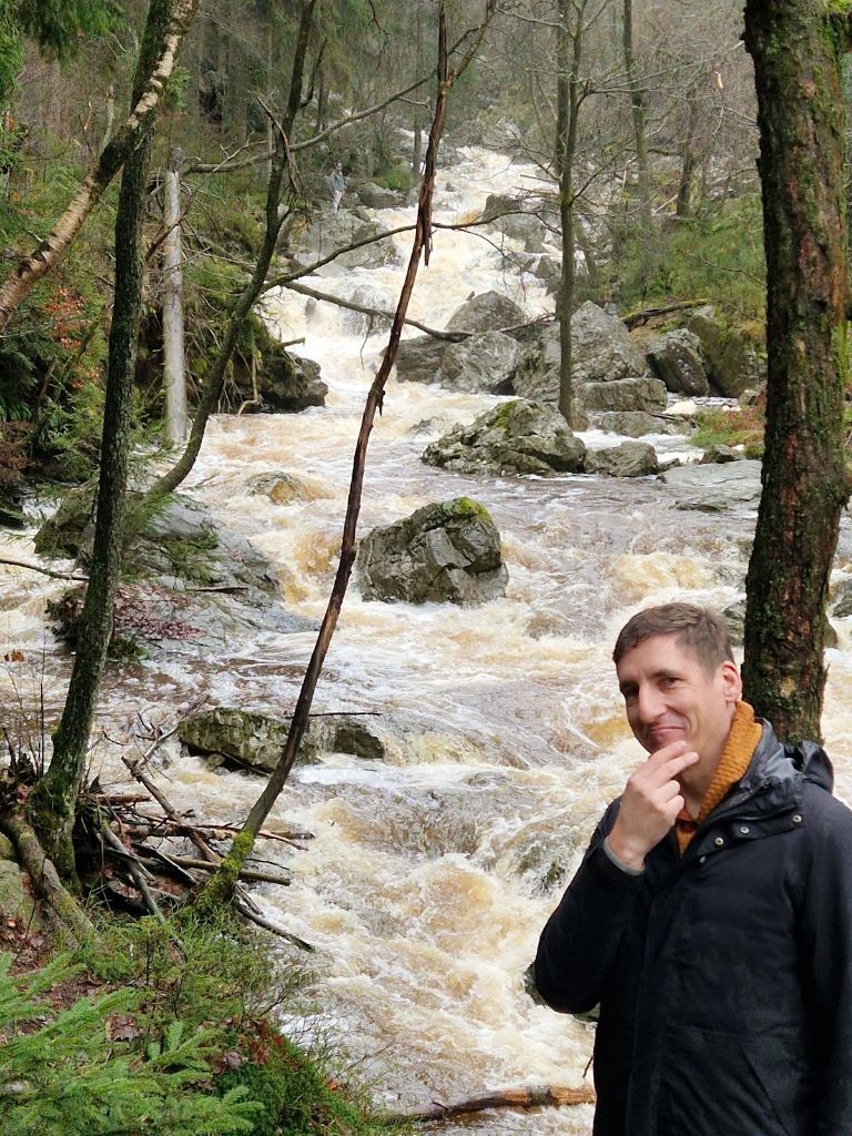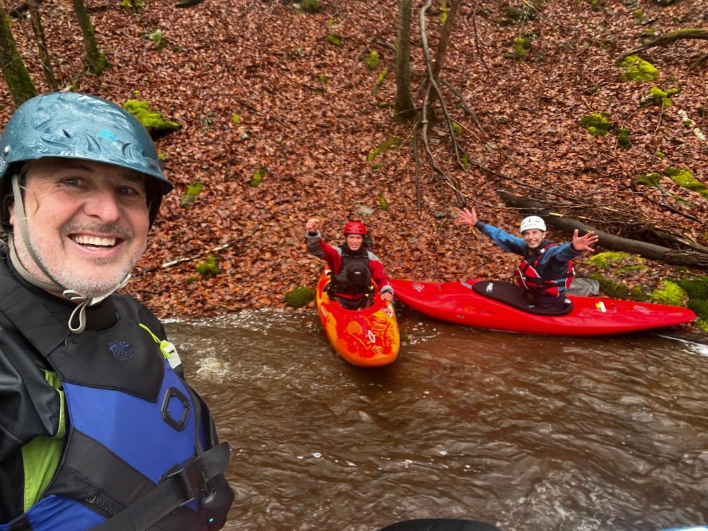 Ik ben eigenlijk wel blij dat we met een kleine ploeg zijn op deze Alpenbeek met Ardense-attracties. De bochten volgen elkaar in hoog tempo op. Vaak zien we de bomen pas op het laatste moment. Dan volgt een split-second beslissing: kunnen we ons daar nog doorheen persen of zou dat twijfelachtig kleine keerwatertje mij kunnen houden? Dat aangevuld met een aantal bekende betonnen stuwen die met deze waterstand flink zog geven. Er was ook een nieuwe stuw in de buurt van Gouffre des Moutons, stroomaf van Solwaster. De sporen waren overduidelijk. Hier hebben bevers hun slag geslagen.