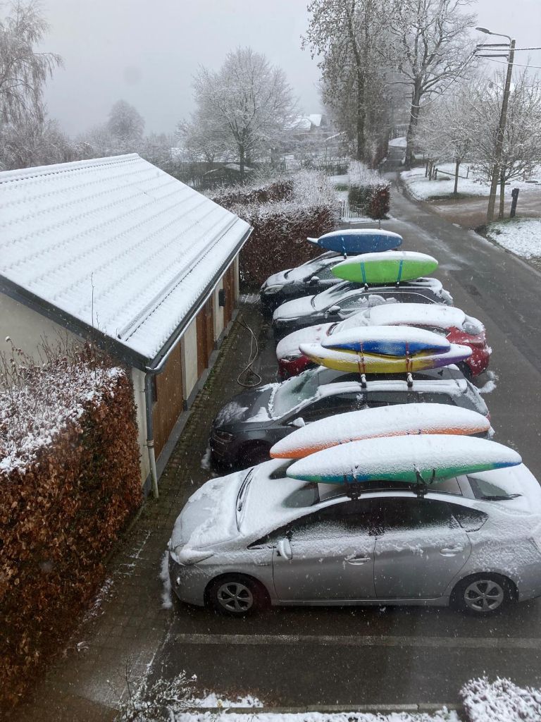 Het eerste beginnersweekend van dit kalenderjaar stond op de agenda en deze had ik daarom ook dik onderstreept in mijn agenda. Of en waar er genoeg water zou staan was eigenlijk tot op het laatste moment niet geheel duidelijk dus hadden de organisatoren Hans en Hein gekozen voor een huisje dat strategisch op een plek in de Ardennen lag zodat we zowel naar de Eifel als binnen de Ardennen konden uitwijken. Het werd een gezellige groepsaccommodatie (Résidence D’ol Vich Périr) in Ondenval/Waimes net voorbij Malmedy. Bij aankomst sneeuwde het dikke vlokken en de volgende ochtend lag er een mooie witte deken over het gebied waar we waren.