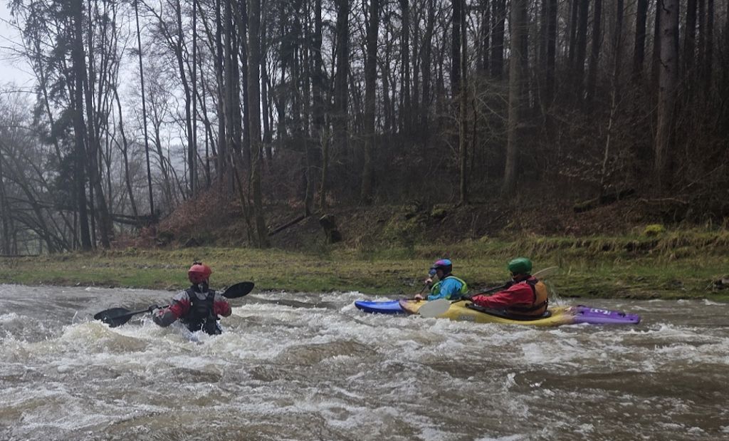 De Prȕm is mooi gelegen tussen de bossen en de heuvels en in de 12 km die we gevaren hebben kom je links en rechts allerlei mooie watervalletjes tegen. De rivier kent diverse plekken met een mooi verval, er zitten een paar plekken in waar een mooie golf stond om in te spelen en deze werden afgewisseld door wat rustigere stukken waar er nauwelijks iets gebeurde op het wateroppervlak terwijl de stroming er weldegelijk was. Op zich prima voor beginners om weer even op adem te komen en dit gaf ook de gelegenheid om van de natuur om ons heen te genieten.