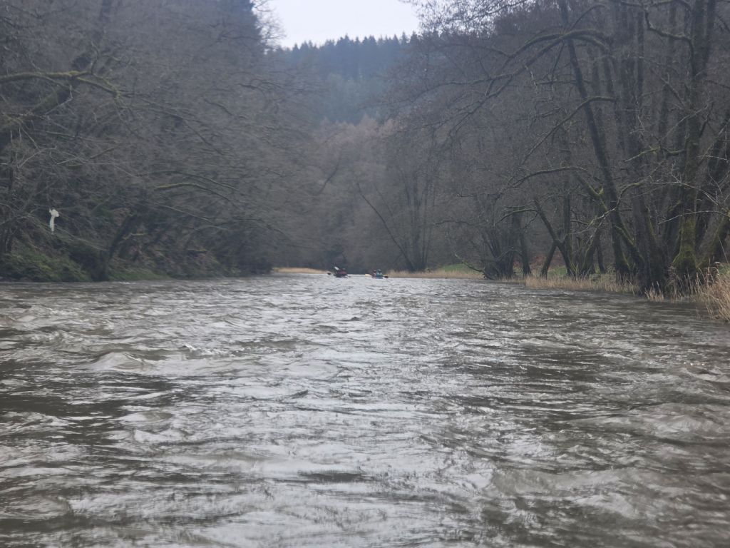 Als beginner had ik persoonlijk liever alleen de wat ruimere keerwaters in het begin gepakt en dat misschien langzaam opgebouwd naar de wat krappere en uitdagendere keerwaters. Ik begrijp ook dat de wat meer gevorderde vaarders de moeilijkheid hiervan misschien wat overschatten door hun jarenlange ervaring. Dus in een van de eerste keerwaters waar er weinig plek was voor twee boten en waar ik toch in moest varen sloeg ik om, omdat ik op de keerwaterlijn bleef liggen, weer meegetrokken werd door de stroming, m’n balans kwijt was. Omdat m'n vertrek iets gehaaster was, had ik niet alles in m’n boot vastgelegd en was ik bang dat ik m'n lunch kwijt zou raken. Dus toen ik omging was mijn eerste prio de boot omdraaien en zorgen dat ik mijn lunch veilig kon stellen. Niet het handigste om vervolgens met een boot in de hand naar de kant te komen, maar op dat moment verloor ik van alles uit m'n boot en wilde ik niet ook nog met honger de dag eindigen en we waren pas net onderweg. Ik zag een van m'n waterflessen wegdrijven, maar die had Jacques gelukkig later weer opgevist. Wel ben ik mijn Palm pouches verloren die ik om mijn peddel had gedaan in de verwachting dat het koud zou zijn. Die had ik er kort daarvoor af gehaald, omdat ik ze niet nodig bleek te hebben en ze in het midden van mijn peddel ook in de weg zaten. Helaas had ik niet de tijd om ze netjes op te bergen, dus ik had ze onder mijn spatzeil gedaan en die waren nu dus weggespoeld. Nadat de boot weer leeg was en Bram mijn lunch in zijn boot had gedaan zijn we weer verder gegaan.