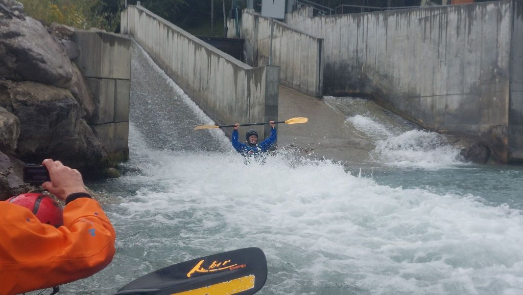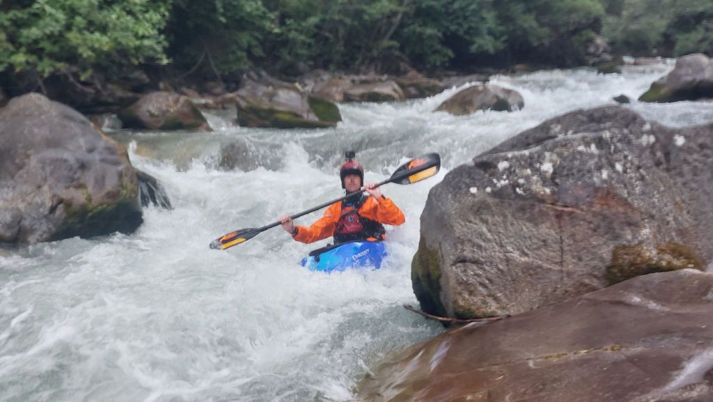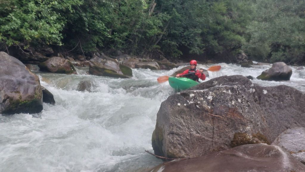 Tom is onze voorvaarder en geeft aan dat we daarom wat meer afstand moeten houden tot elkaar. Mocht de raft vast komen te zitten, hebben we tijd om allemaal een eigen keerwater te zoeken want grote keerwaters zijn hier schaars. Ik besluit op een andere manier tijd te rekken: ik kies één van de vele stenen om de onderkant van mijn boot tegenaan te plakken en kan dat nog wel even rekken met een hoge steun. Maar tegen de tijd dat ik op mijn achterdek lig en mijn boot verder wil stap ik toch maar uit omdat het me niet zo'n goed idee lijkt op zijn kop de passage te varen. Ik red mijn peddel en mezelf maar mijn boot is voor Tom en Sjoerd. Dat is even een klus voor de mannen (want weinig grote keerwaters) en een boswandeling voor mij (gelukkig bos en geen kloof).